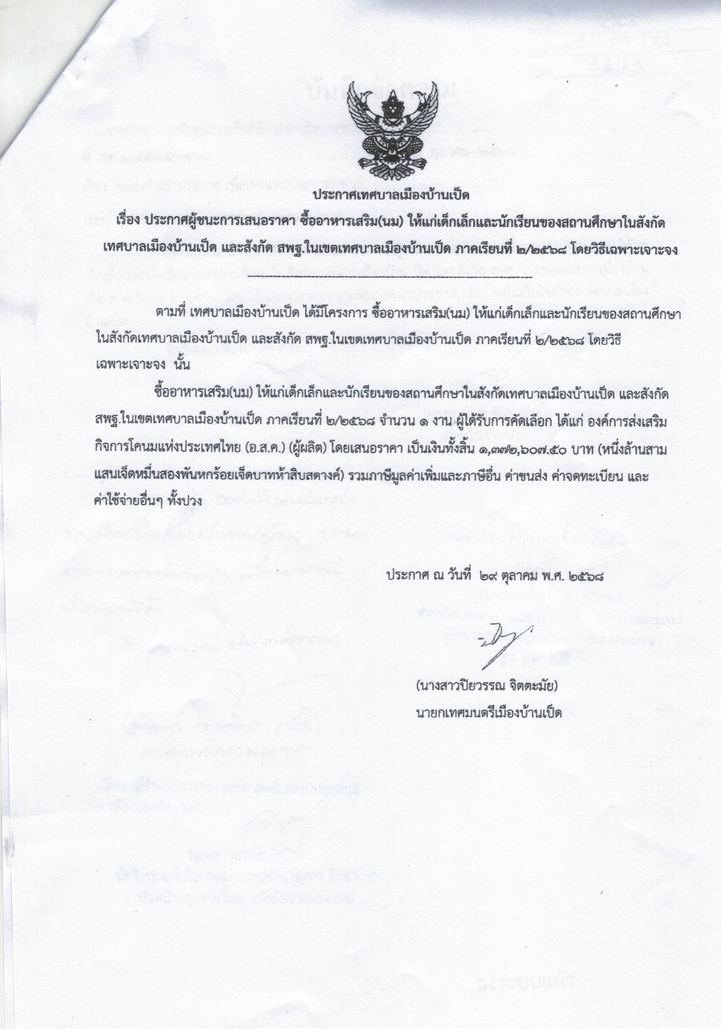 ประกาศผู้ชนะการเสนอราคา ซื้ออาหารเสริม (นม) ให้แก่เด็กเล็กและนักเรียนของสถานศึกษาในสังกัดเทศบาลเมืองบ้านเป็ด และสังกัด สพฐ.ในเขตเทศบาลเมืองบ้านเป็ด ภาคเรียนที่ 2/2568 โดยวิธีเฉพาะเจาะจง