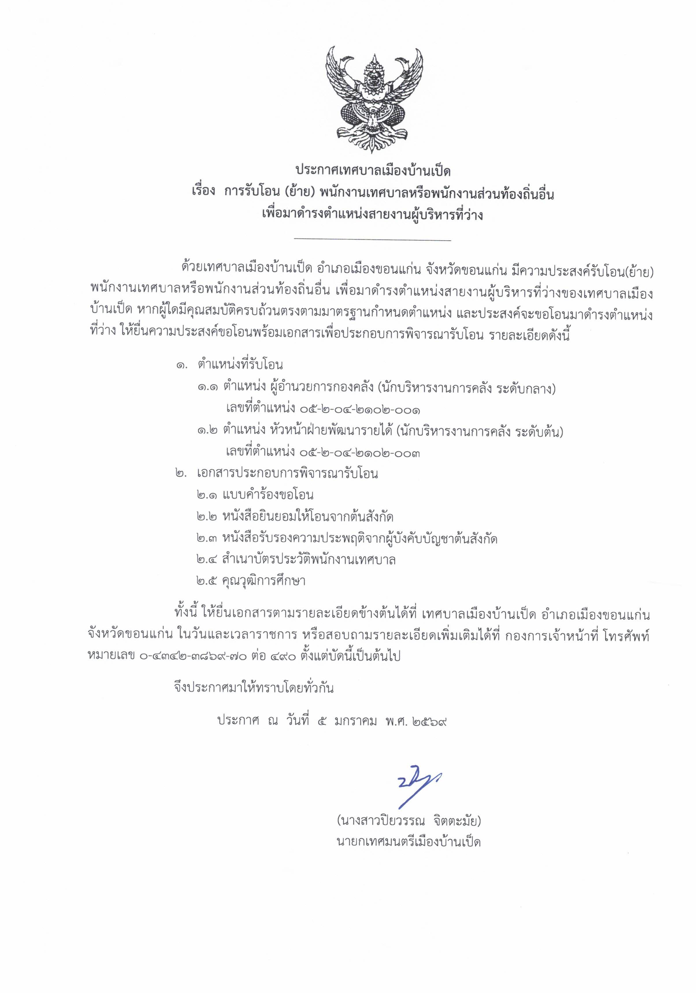 ประกาศเทศบาลเมืองบ้านเป็ด เรื่อง การรับโอน (ย้าย) พนักงานเทศบาลหรือพนักงานส่วนท้องถิ่นอื่น เพื่อมาดำรงตำแหน่งสายงานผู้บริหารที่ว่าง