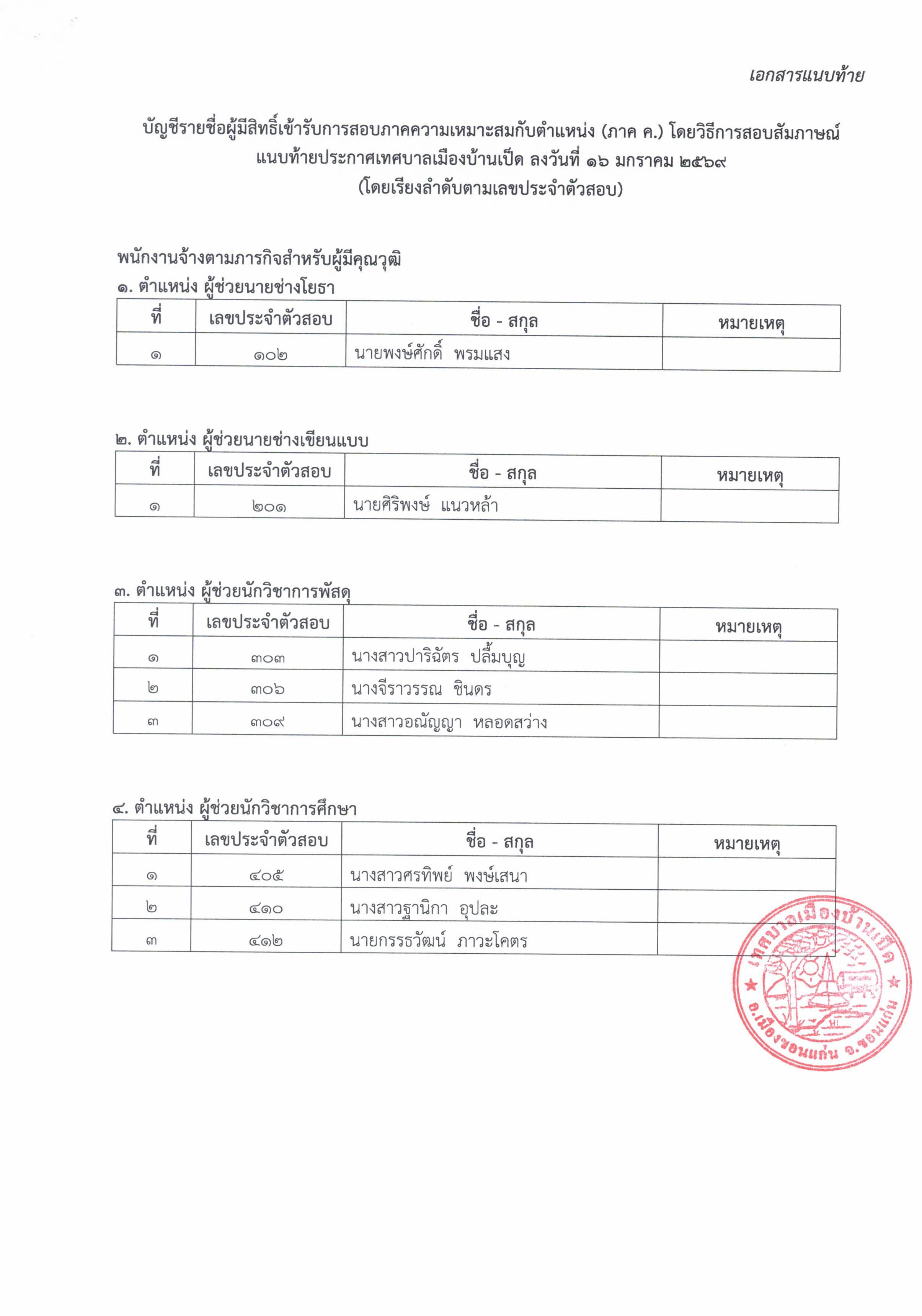 ประกาศรายชื่อผู้มีสิทธิเข้ารับการสอบภาคความเหมาะสมกับตำแหน่ง (ภาค ค.) โดยวิธีการสัมภาษณ์ เพื่อแต่งตั้งเป็นพนักงานจ้าง สังกัดเทศบาลเมืองบ้านเป็ด