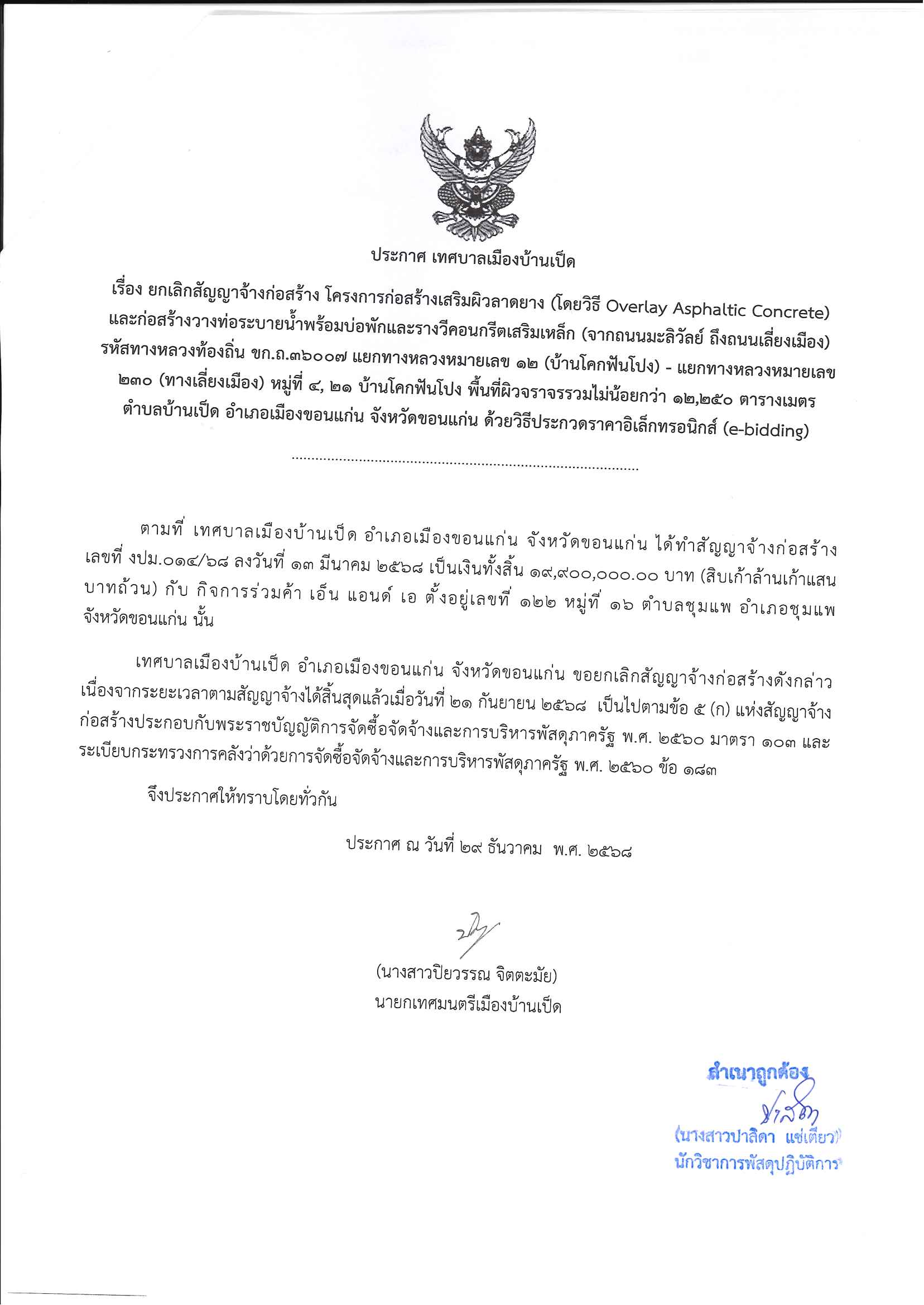 ประกาศเทศบาลเมืองบ้านเป็ด เรื่อง ยกเลิกสัญญาจ้างก่อสร้าง โครงการก่อสร้างเสริมผิวลาดยาง (โดยวิธี Overlay Asphaltic Concrete) และก่อสร้างวางท่อระบายน้ำพร้อมบ่อพักและรางวีคอนกรีตสเริมเหล็ก (จากถนนมะลิวัลย์ ถึงถนนเลี่ยงเมือง) รหัสทางหลวงท้องถิ่น ขก.ถ.36007 แยกทางหลวงหมายเลข 12 (บ้านโคกฟันโปง) - แยกทางหลวงหมายเลข 230 (ทางเลี่ยงเมือง) หมู่ที่ 4,21 บ้านโคกฟันโปง พื้นที่ผิวจราจรรวมไม่น้อยกว่า 12,250 ตารางเมตร ตำบลบ้านเป็ด อำเภอเมืองขอนแก่น จังหวัดขอนแก่น ด้วยวิธีประกวดราคาอิเล็กทรอนิกส์ (e-bidding)