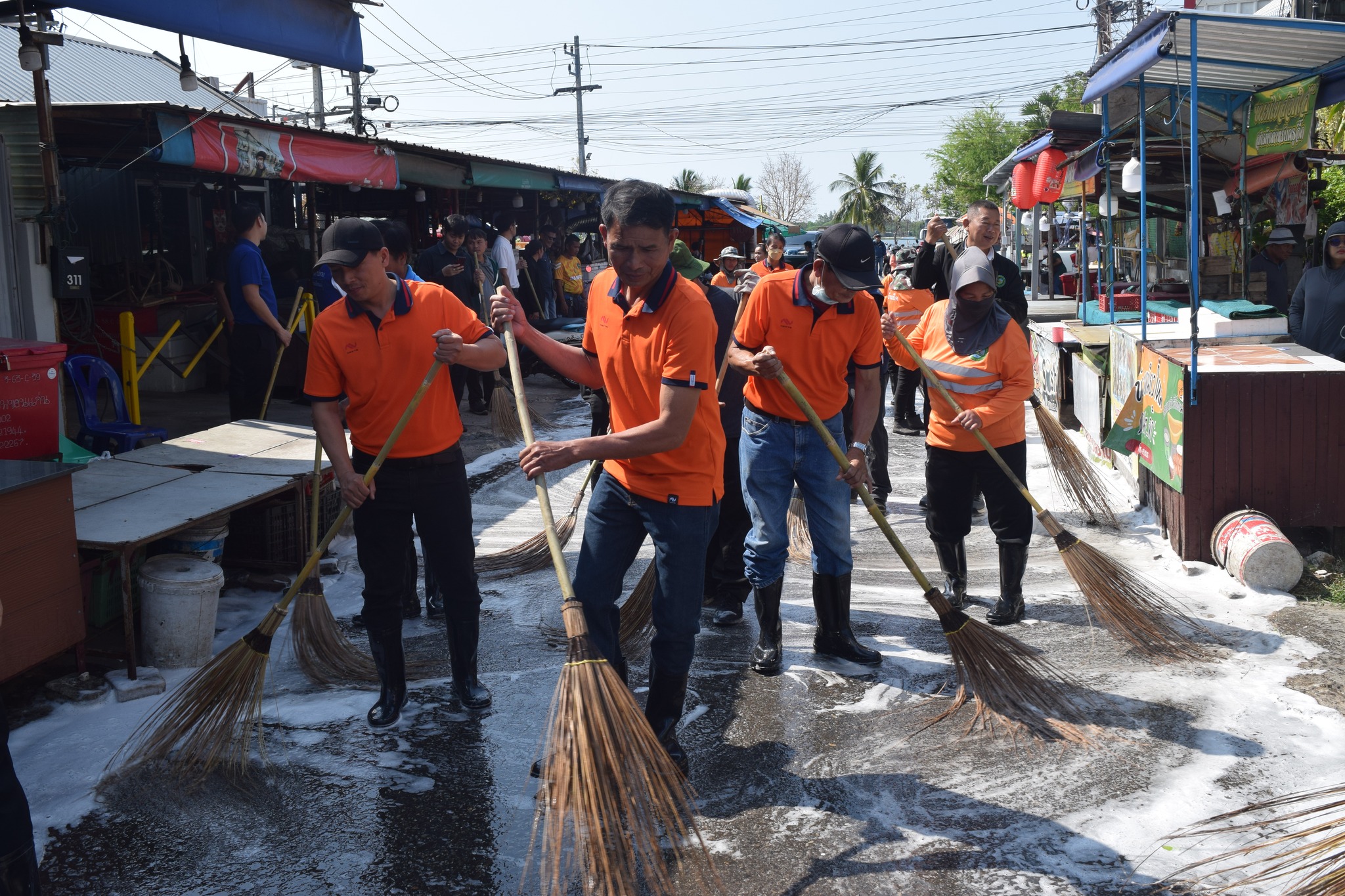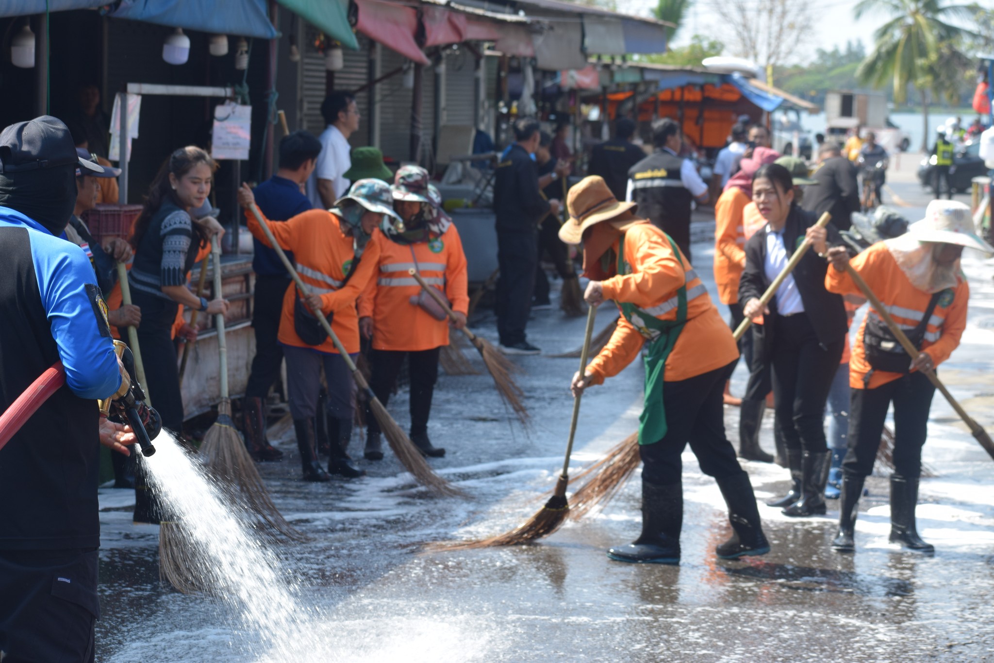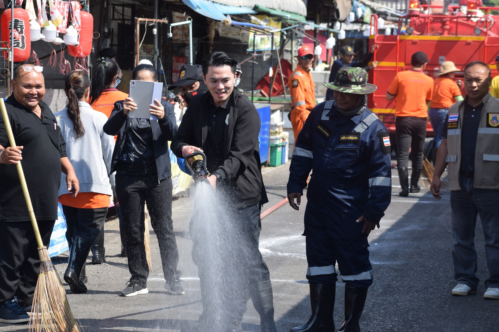 กล่าวเปิดโครงการ พร้อมด้วยนายกเทศมนตรี คณะผู้บริหาร หัวหน้าส่วนราชการ เจ้าหน้าที่เทศบาล กำนัน และผู้ใหญ่บ้าน เข้าร่วมกิจกรรมล้างทำความสะอาดถนน เพื่อลดปัญหาฝุ่นละอองและปรับปรุงสภาพแวดล้อม