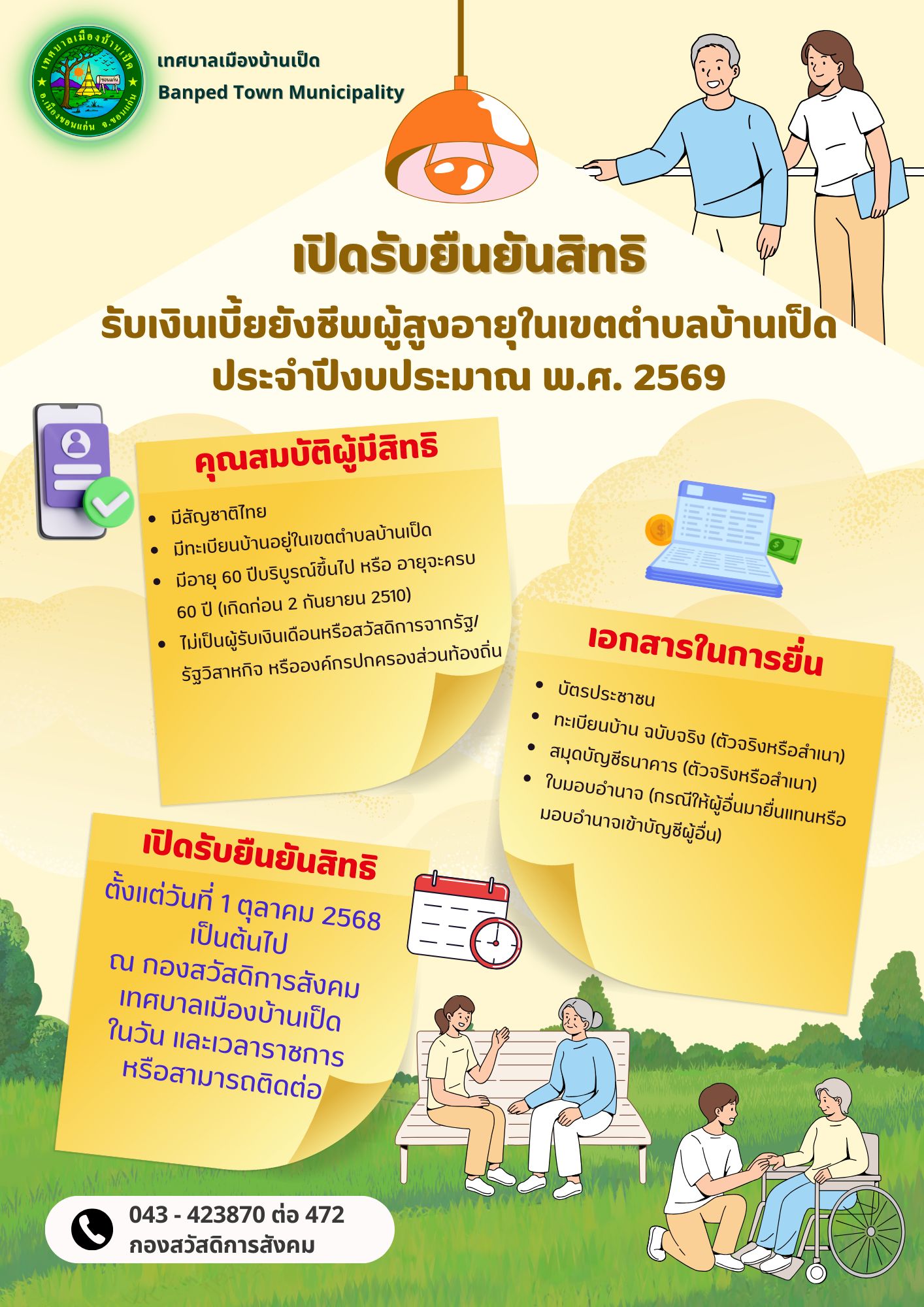 ประชาสัมพันธ์การรับยืนยันสิทธิรับเงินเบี้ยยังชีพผู้สูงอายุในเขตตำบลบ้านเป็ด ประจำปีงบประมาณ พ.ศ. 2569
