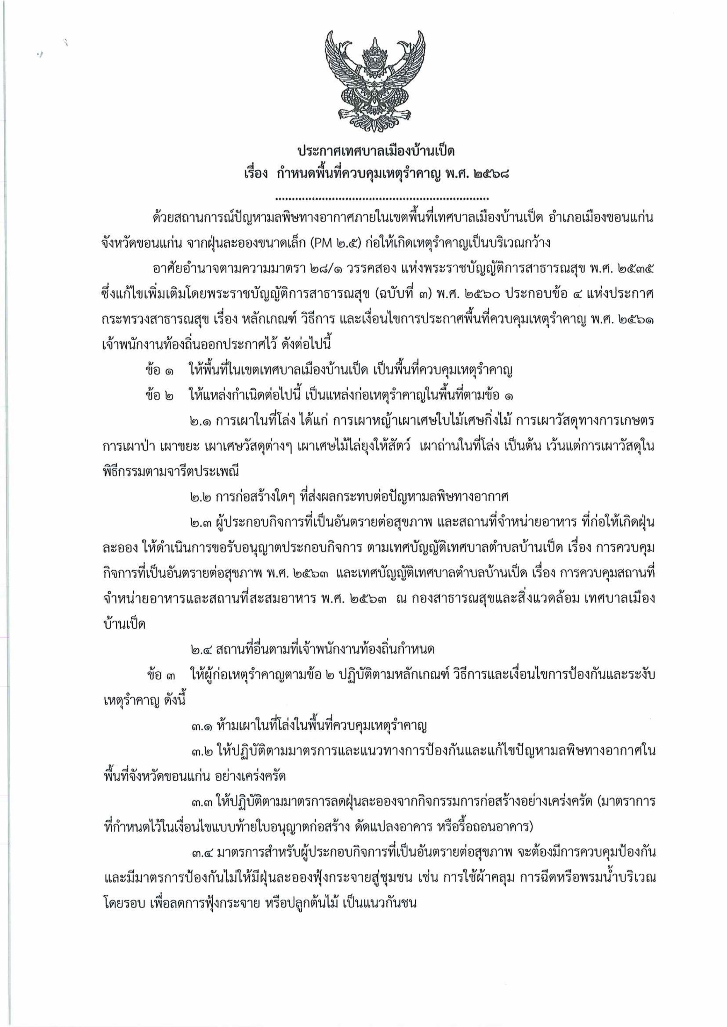 ประกาศเทศบาลเมืองบ้านเป็ด เรื่อง กำหนดพื้นที่ควบคุมเหตุรำคาญ พ.ศ.2568