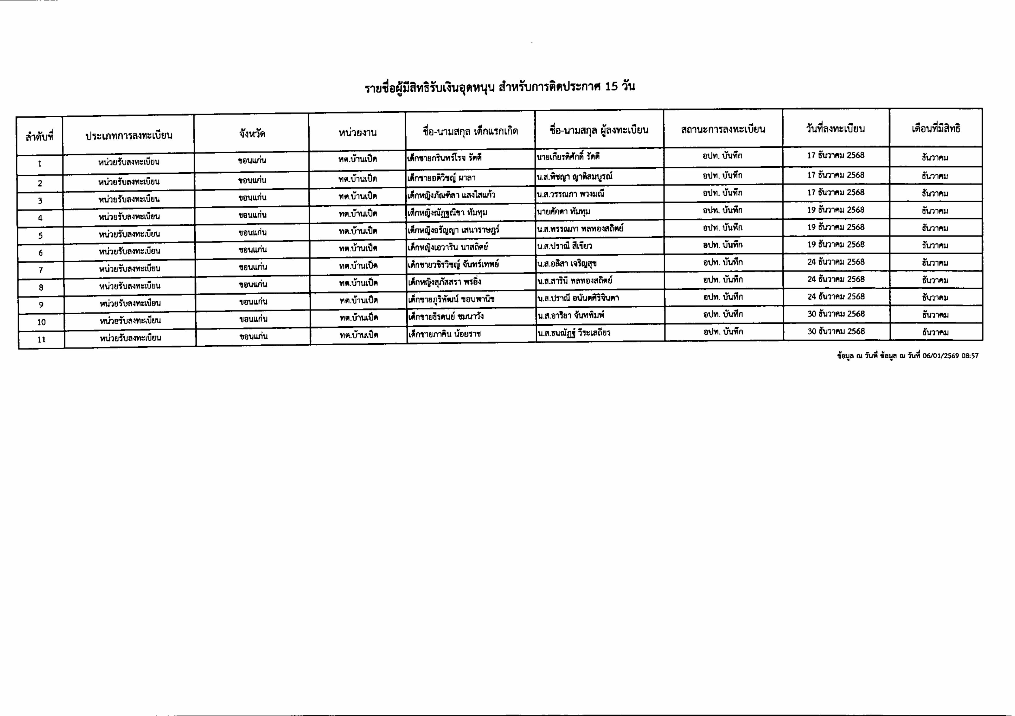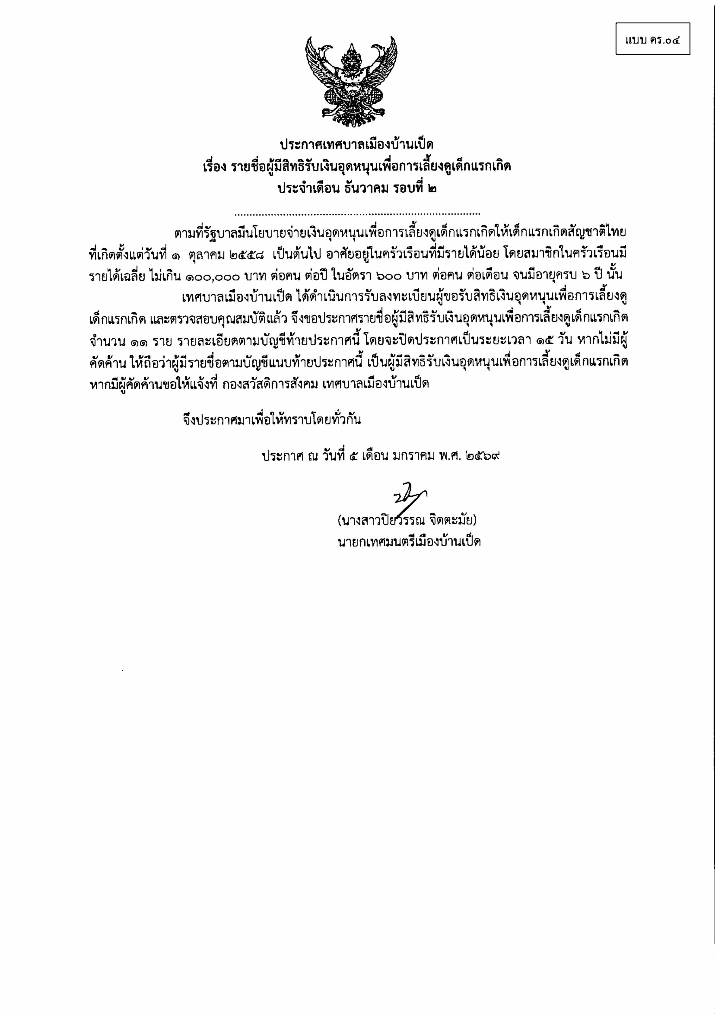 ประกาศเทศบาลเมืองบ้านเป็ด เรื่อง รายชื่อผู้มีสิทธิรับเงินอุดหนุนเพื่อการเลี้ยงดูเด็กแรกเกิด ประจำเดือน ธันวาคม ครั้งที่ 2