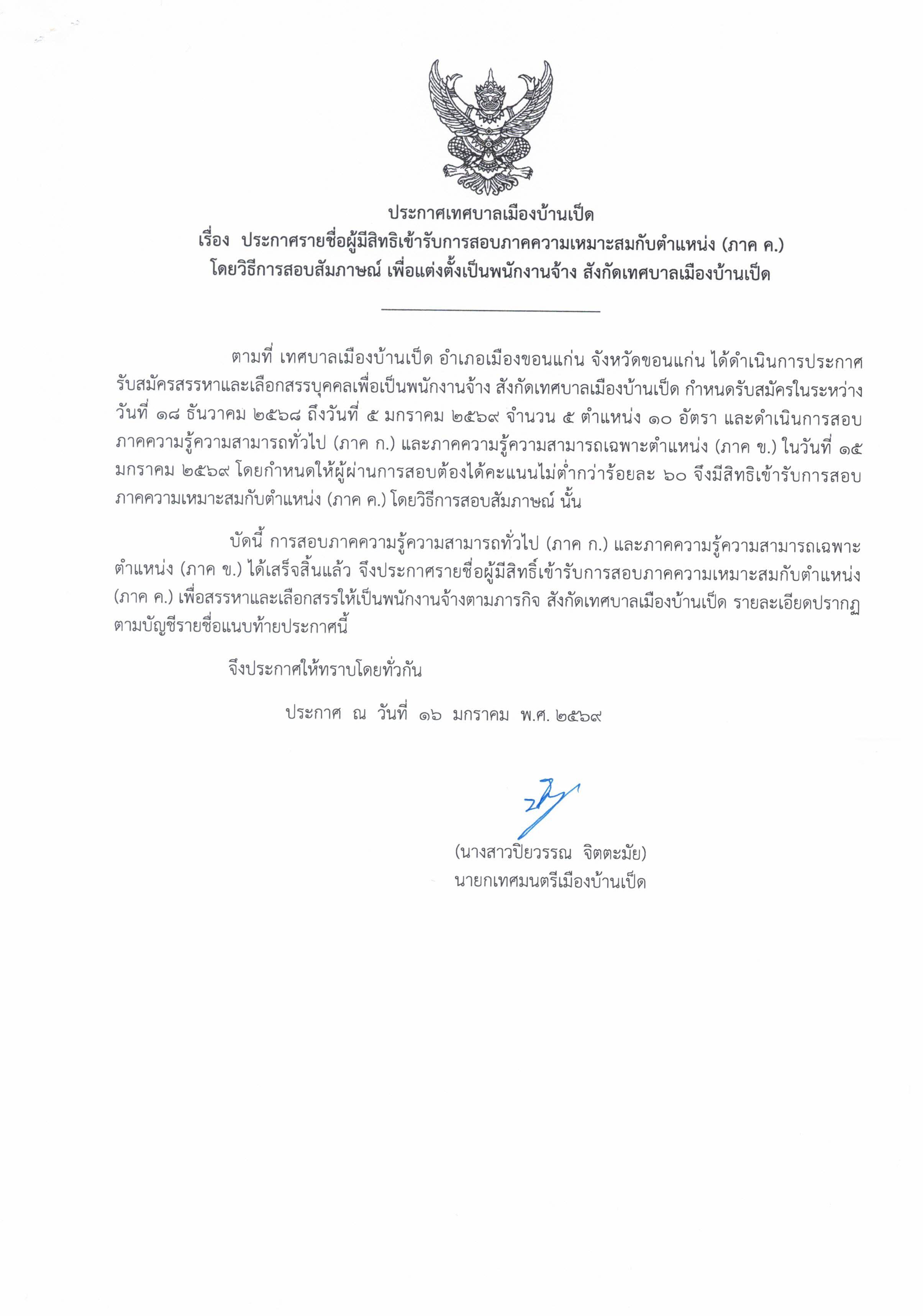 ประกาศรายชื่อผู้มีสิทธิเข้ารับการสอบภาคความเหมาะสมกับตำแหน่ง (ภาค ค.) โดยวิธีการสัมภาษณ์ เพื่อแต่งตั้งเป็นพนักงานจ้าง สังกัดเทศบาลเมืองบ้านเป็ด