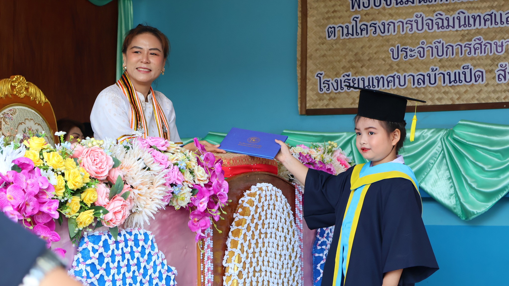 ต่อกัน และแสดงความยินดีแก่นักเรียนที่สำเร็จการศึกษา